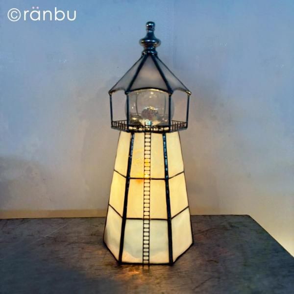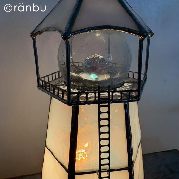 白いトーンでいろんな模様がうっすら入ったガラスを使ったステンドグラスの灯台の作品です。
